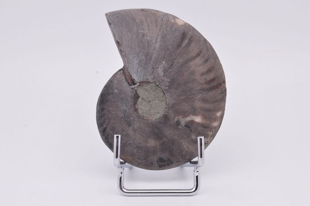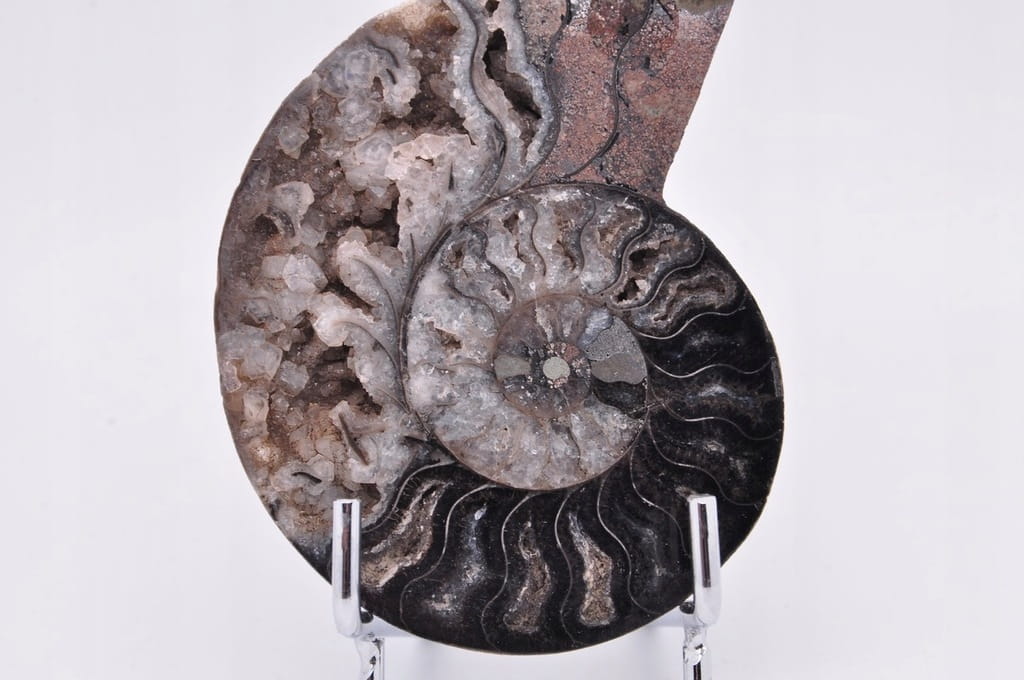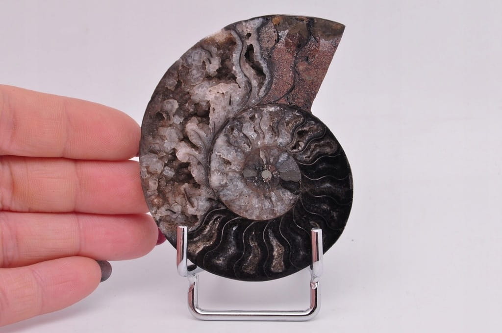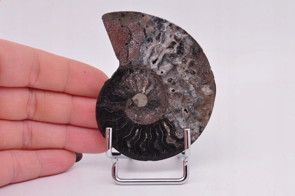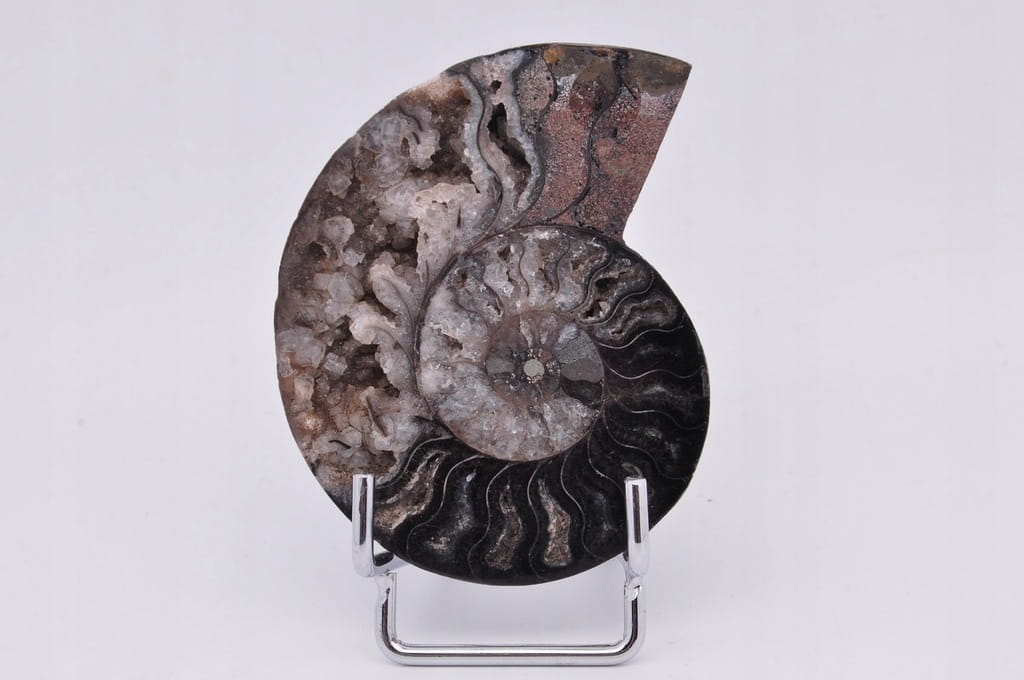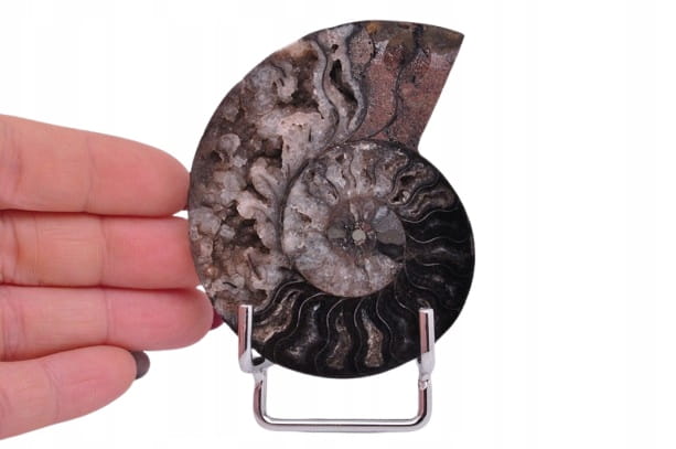 POŁÓWKA AMONITA CZARNEGO, PIĘKNIE ZACHOWANY OKAZ. JEST TO SKAMIENIAŁOŚĆ POCHODZĄCA Z MADAGASKARU, DATOWANA NA OKRES KREDY. UNIKATOWY OKAZ PRZECIĘTY I WYPOLEROWANY JEDNOSTRONNIE. BARDZO RZADKI CZARNY OKAZ.