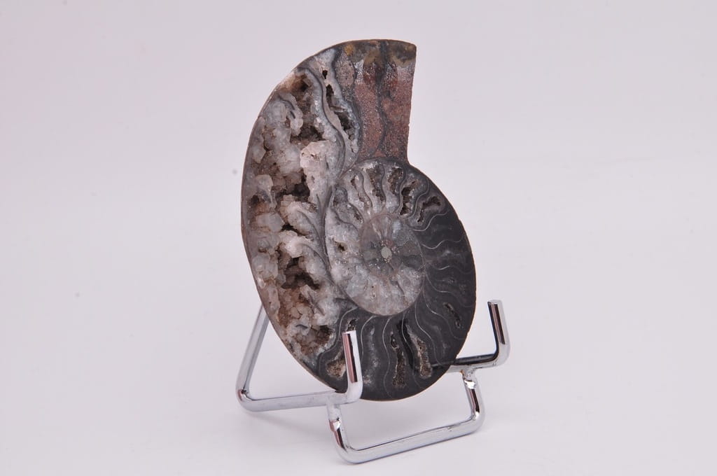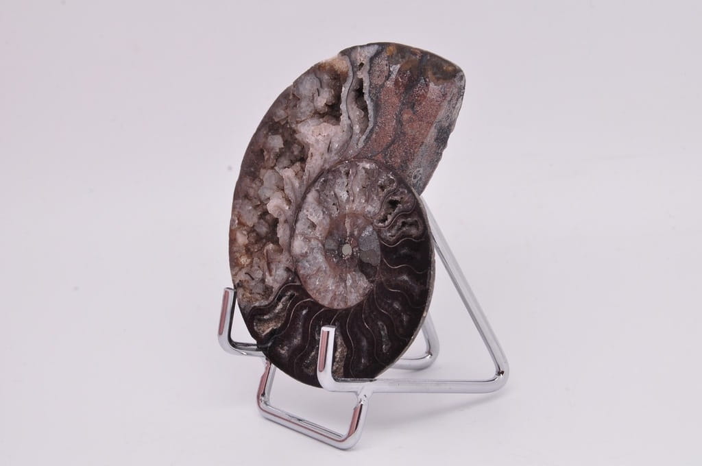 Amonity, amonitowate (Ammonoidea) – podgromada wymarłych głowonogów (Cephalopoda), przeważnie o symetrycznej, płaskospiralnej skorupie. Nieliczne rodzaje miały nietypowe kształty, np. prostej muszli, spirali zwiniętej w pionie, spirali o niestykających się skrętach. Występują w skałach pochodzenia morskiego z okresu od dewonu do końca kredy. Niektóre z poszczególnych komór są otwarte i wypełnione bogatym zestawem beżowych szarych i brązowych kryształów kalcytu, z przegrodami między każdą komorą.
