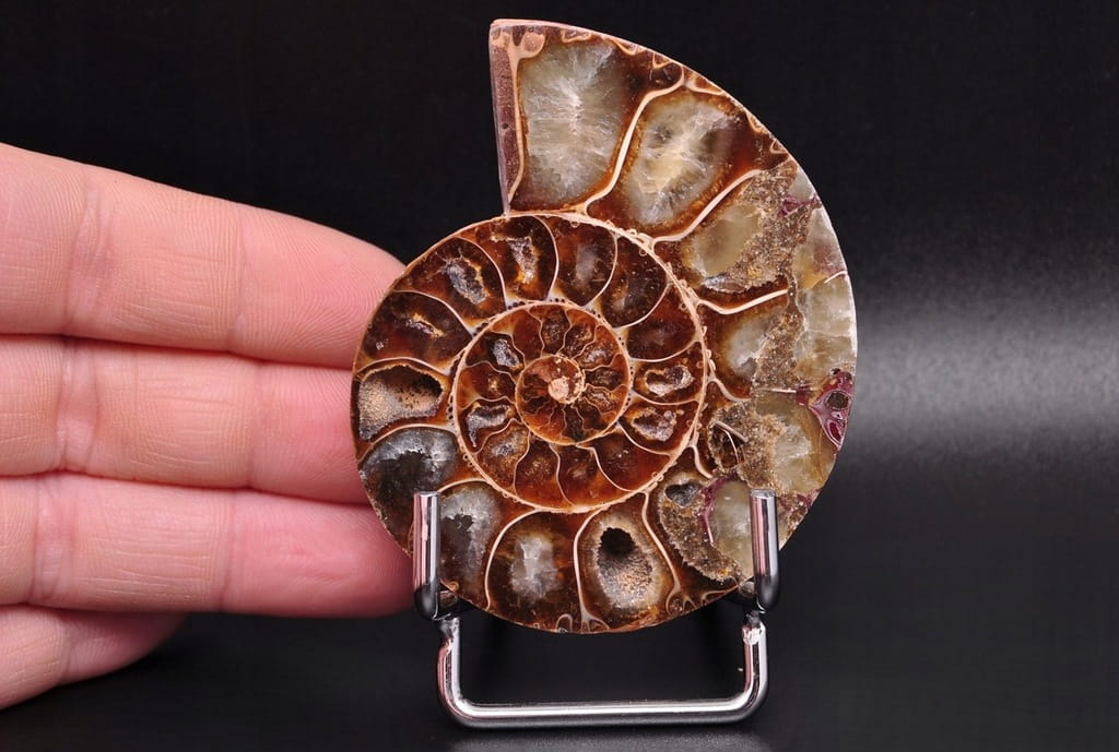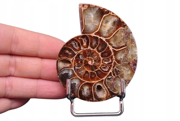 Amonity, amonitowate (Ammonoidea) – podgromada wymarłych głowonogów (Cephalopoda), przeważnie o symetrycznej, płaskospiralnej skorupie. Nieliczne rodzaje miały nietypowe kształty, np. prostej muszli, spirali zwiniętej w pionie, spirali o niestykających się skrętach. Występują w skałach pochodzenia morskiego z okresu od dewonu do końca kredy. Niektóre z poszczególnych komór są otwarte i wypełnione bogatym zestawem beżowych szarych i brązowych kryształów kalcytu, z przegrodami między każdą komorą.