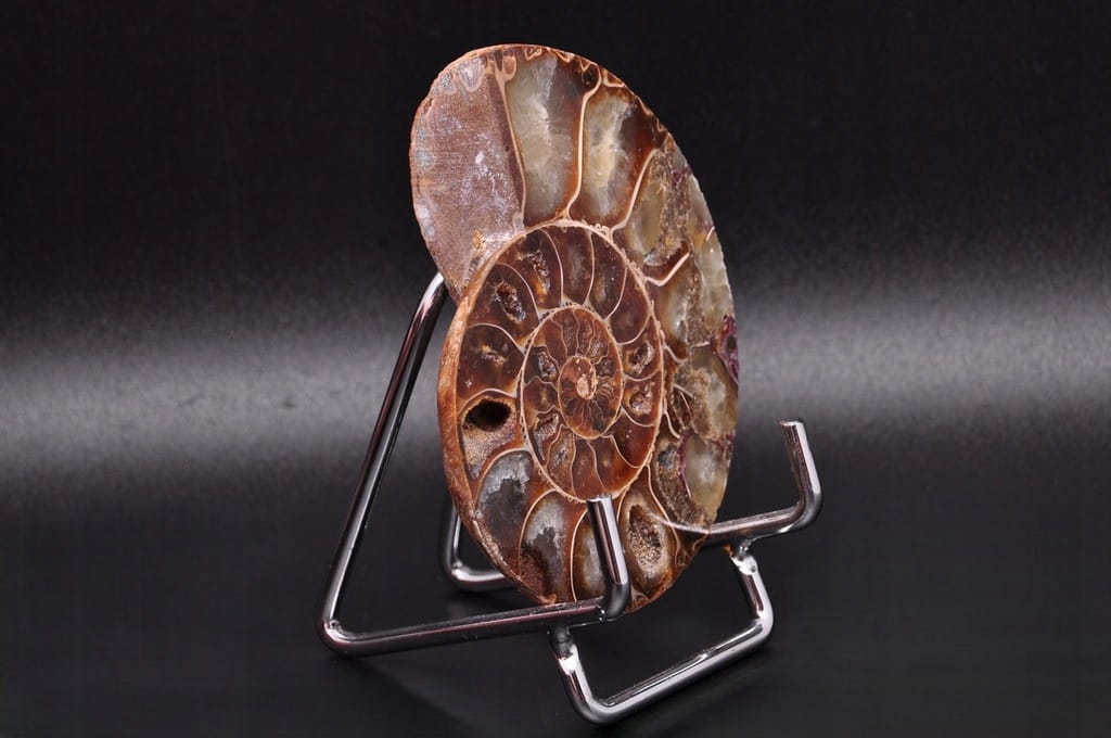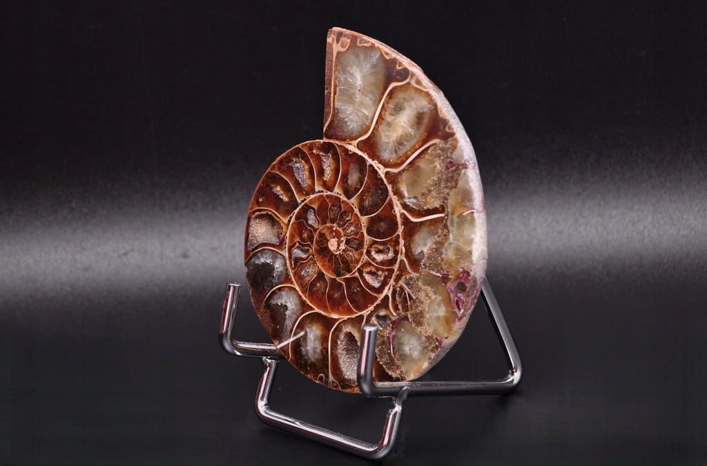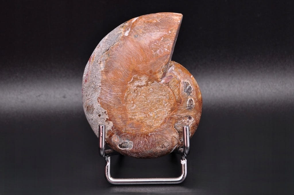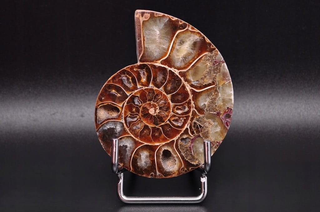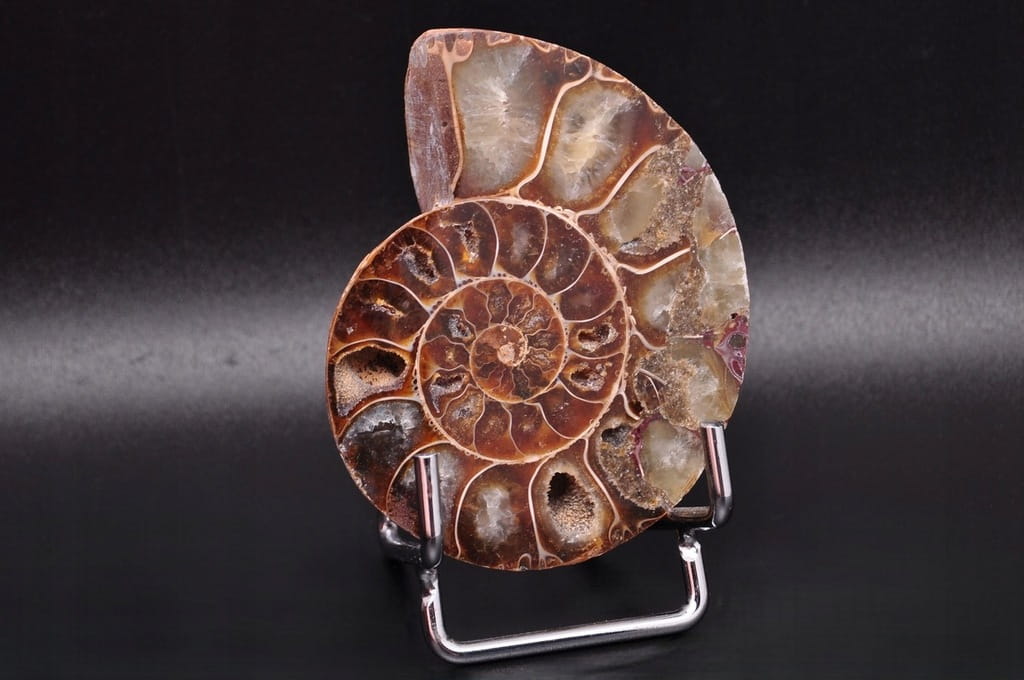 POŁÓWKA AMONITA, PIĘKNIE ZACHOWANY OKAZ. JEST TO SKAMIENIAŁOŚĆ POCHODZĄCA Z MADAGASKARU, DATOWANA NA OKRES KREDY DOLNEJ. UNIKATOWY OKAZ PRZECIĘTY I WYPOLEROWANY JEDNOSTRONNIE.