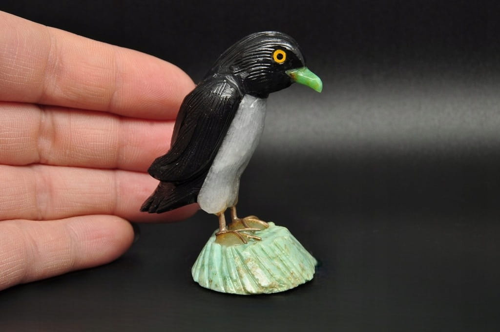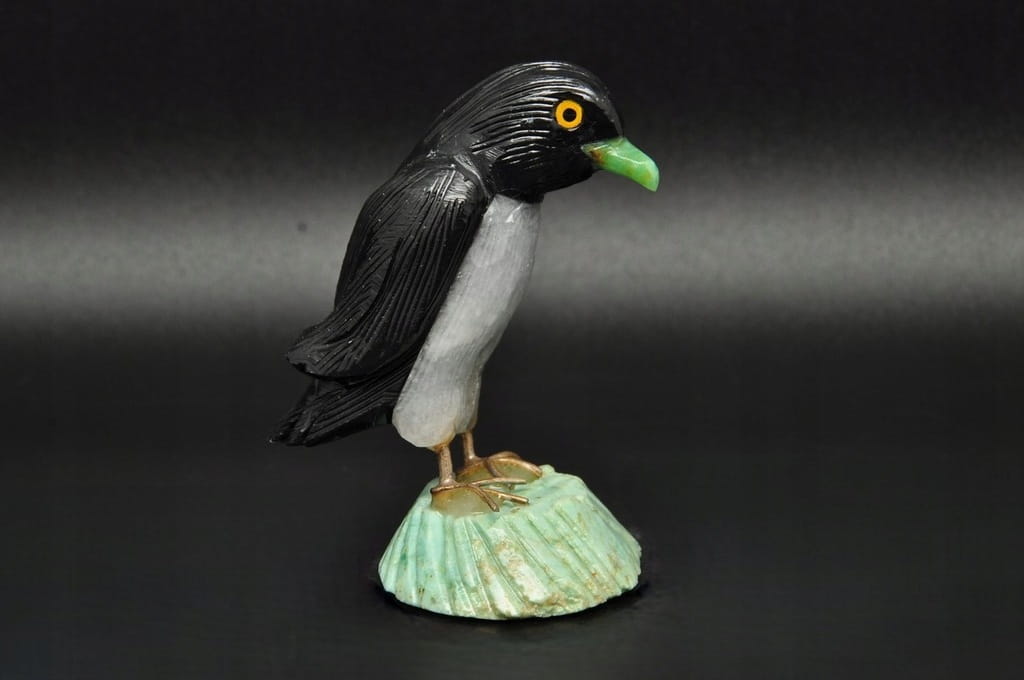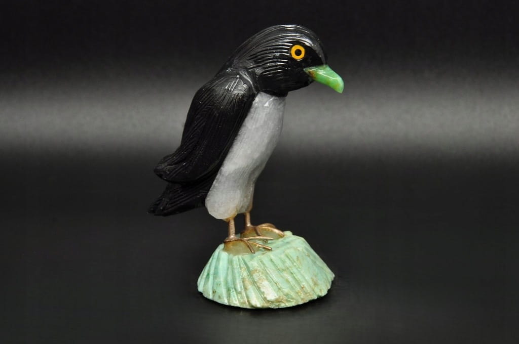 FIGURKA PINGWIN Z NATURALNYCH KAMIENI : CHRYZOPRAZ, ONYKS, KWARC. FIGURKA PRZYKLEJONA DO SKAŁY. DOSKONAŁA DO KOLEKCJI LUB JAKO PREZENT.
