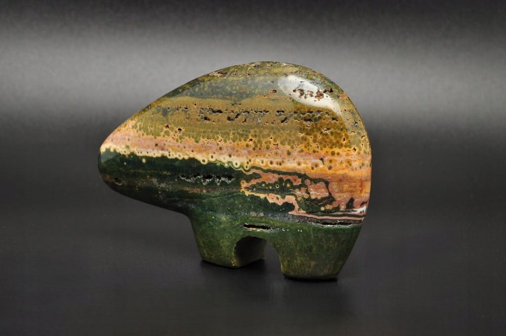 NATURALNY JASPIS ORBIKULARNY, OCEANICZNY - FIGURKA NIEDŹWIEDZIA. INTERESUJĄCA RZEŹBA O CIEKAWYM WZORZE. DOSKONAŁY OKAZ DO KOLEKCJI ORAZ JAKO PREZENT.