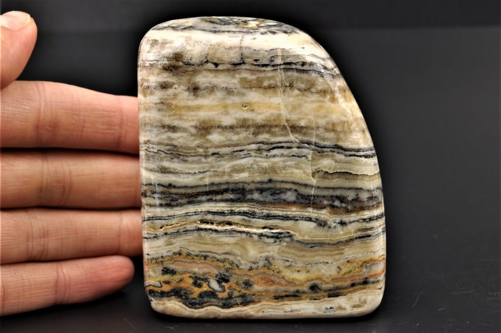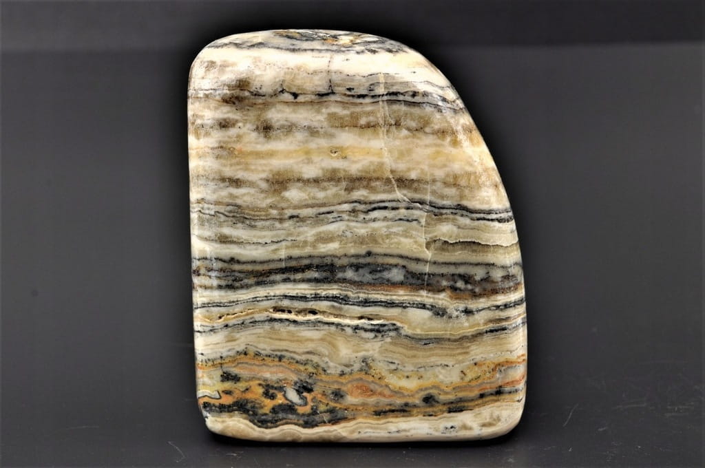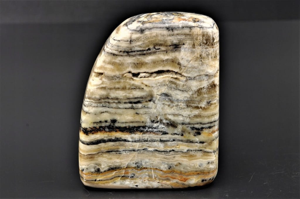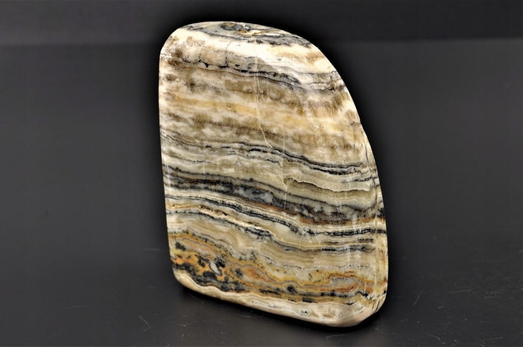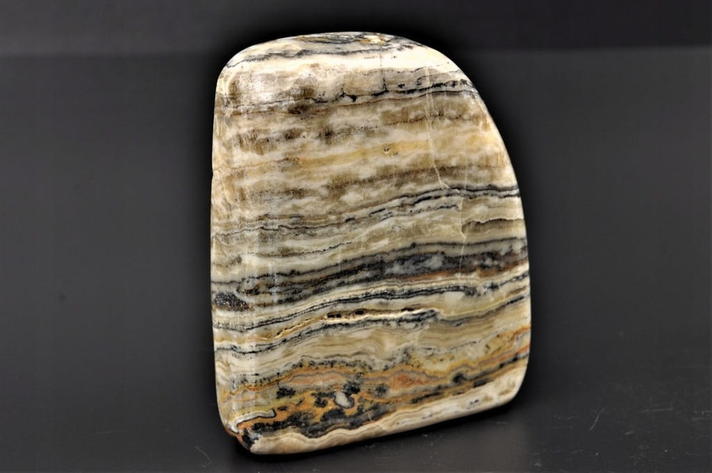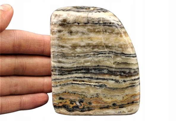 KALCYT ZEBRA, NIEDAWNO ODKRYTY MINERAŁ, POLEROWANY, STOJĄCY OKAZ, SUPER JAKOŚĆ, PIĘKNA BARWA I WZÓR, INTERESUJĄCY DO KOLEKCJI.