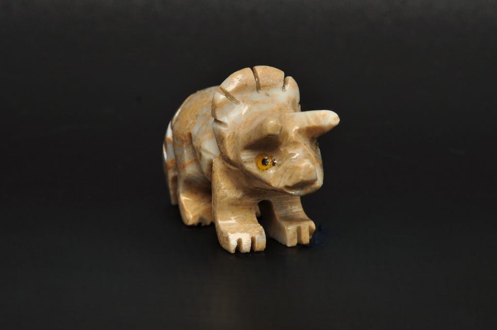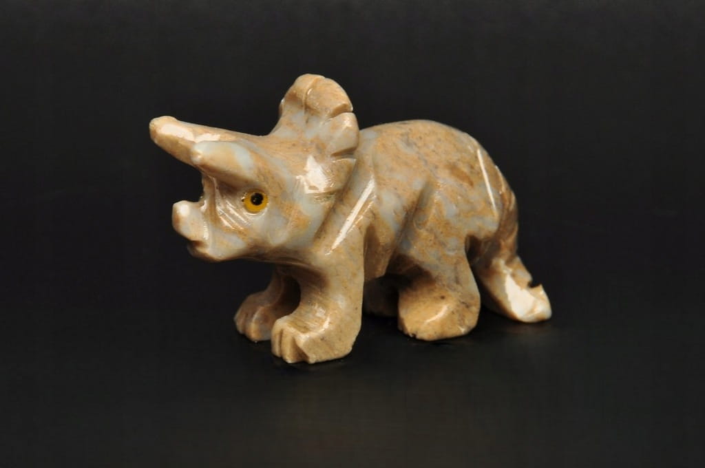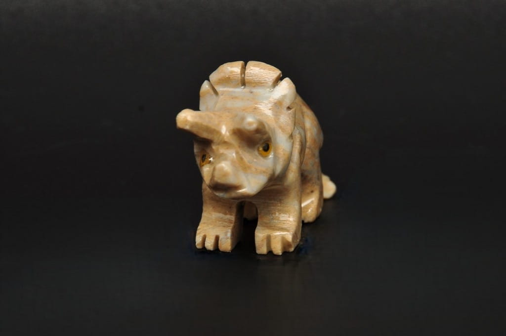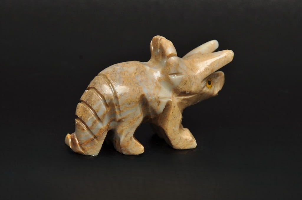 NATURALNA RZEŹBA DINOZAURA TRICERATOPS Z PERU WYKONANA Z KAMIENIA MYDLANEGO (STEATYT). ORYGINALNE RĘKODZIEŁO, DOBRA JAKOŚĆ.