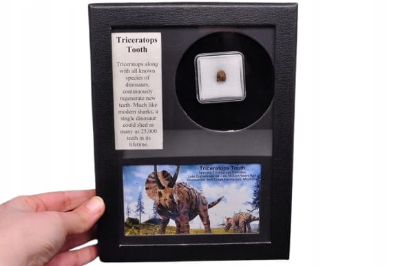 BARDZO DOBRZE ZACHOWANY ZĄB WYMARŁEGO DINOZAURA TRICERATOPS W PUDEŁKU. DOBRA JAKOŚĆ, ŚWIETNY OKAZ DO KOLEKCJI ORAZ JAKO PREZENT.