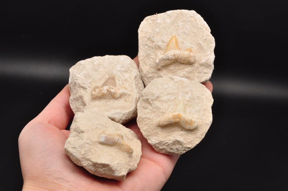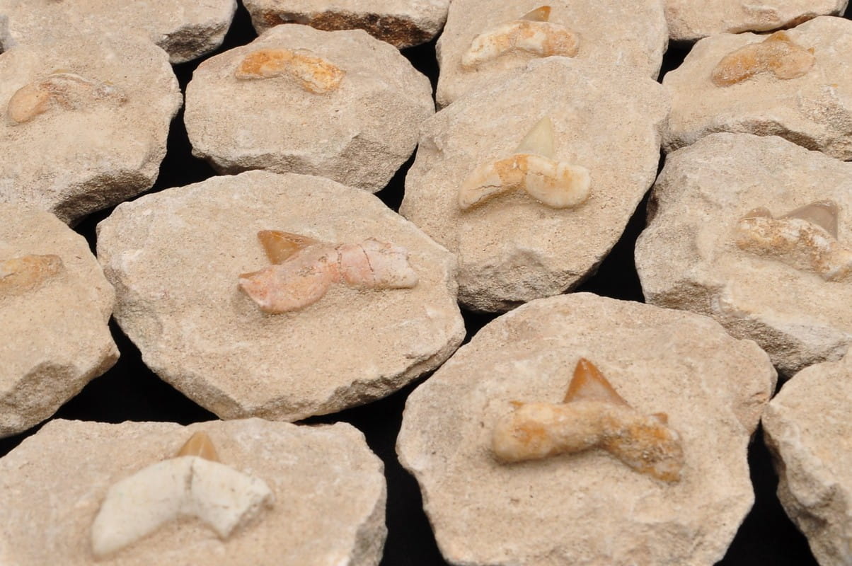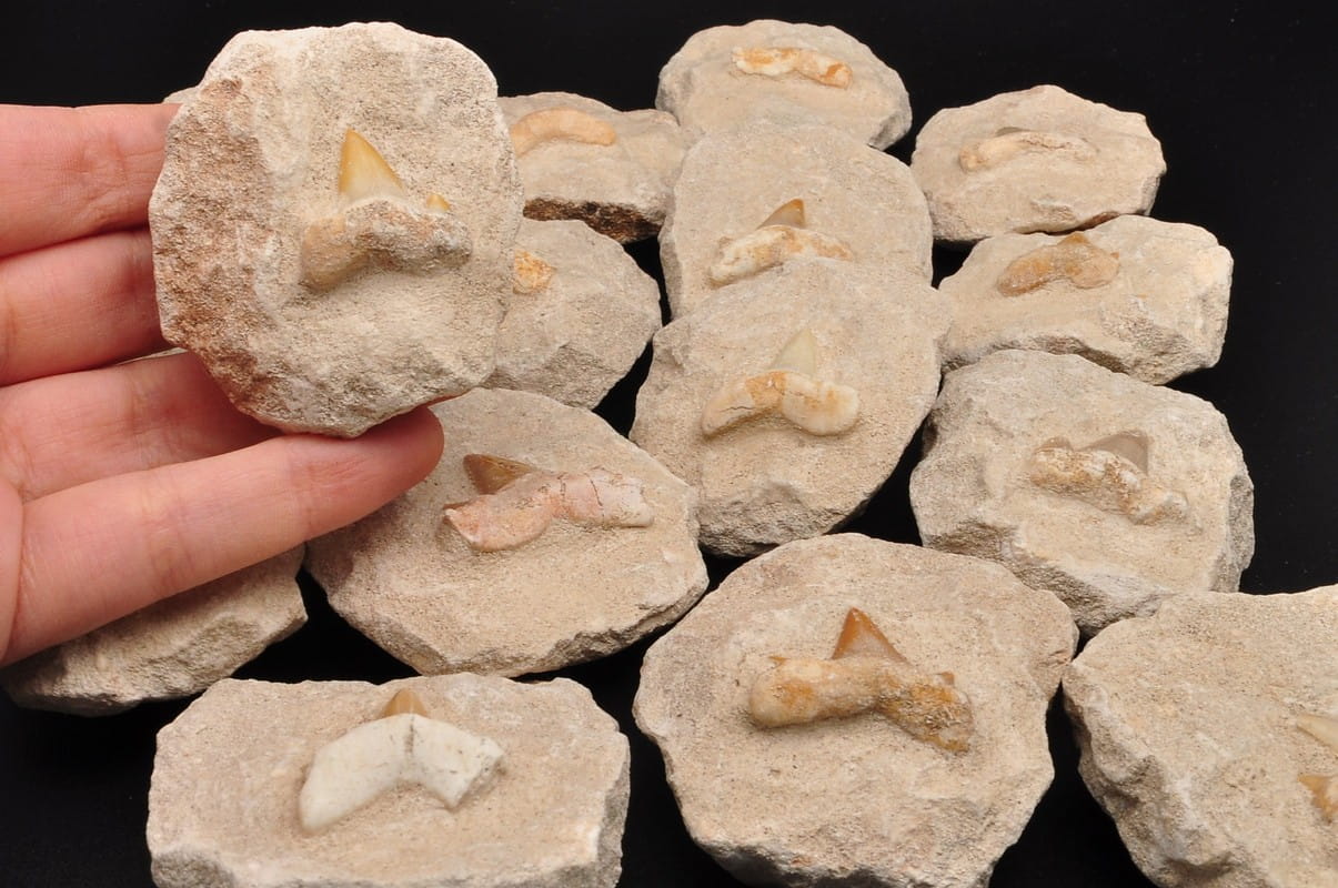 Ząb rekina, gdy wypadnie, opadnie na dno warstwy osadowej, ulegając procesowi fosylizacji, który zajmie co najmniej 10 000 lat. Ząb staje się skamieniałością, gdy zostanie zakopany w osadzie (lub innym materiale) wkrótce po utracie z paszczy rekina. Osad uniemożliwia tlenowi i szkodliwym bakteriom dotarcie do zęba i zniszczenie. Ogólny proces fosylizacji różni się znacznie w zależności od dokładnej sytuacji. Najczęściej zęby rekinów pochodzą z okresu górnej kredy i trzeciorzędu.